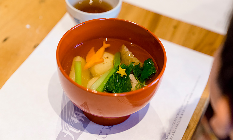「あごだしの色はとてもきれいだった。お雑煮は色々と入っていてお腹いっぱいになった」