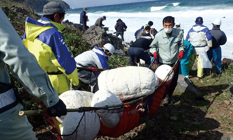 青く澄んだ水面を軽快に跳ねるあごの姿は、生月島の秋の風物詩。しかし近年、この美しい風景に不釣り合いなポリタンクやペットボトルが、日々海岸に打ち寄せる。舘浦漁協では地元住民にも協力を仰ぎながら、漂着ごみの回収活動を毎月行っている。取り組みを始めたのは、鴨川さんが組合長に就任した4年前。それまでは年に一度大掛かりな清掃を行っていたが、悪化の一途をたどる状況に。これ以上目を背けることはできなかった。「きれいにしても数ヶ月後には元に戻ってしまう。でもやり続けることで、その量も徐々に減ってきたんですよ」と鴨川さんは話す。