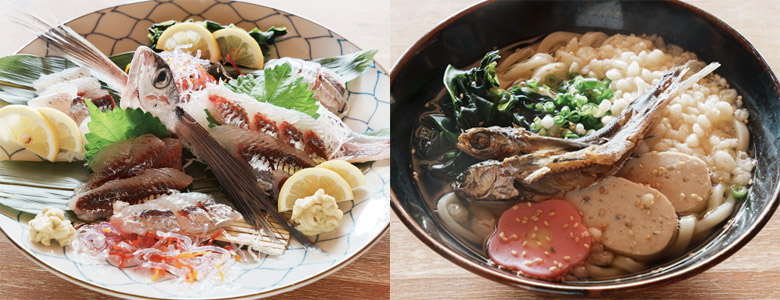 そんな鴨川さんの好物は、あごを塩に漬け込んで干した「塩あご」。おつまみにもご飯のお供にもなる一品だ。「海の環境を守るのが漁業者の使命」と話す鴨川さんの思いを、生月島の豊かな食文化がより一層強くさせる。舘浦漁港のすぐそばに店を構える「お食事処 ひといき」では、水揚げされたばかりの新鮮な魚介が味わえる。地元女性が中心となって切り盛りしており、「うちの一番の売りは看板娘よ!」と茶目っ気たっぷりに迎えてくれる。あご料理も自慢で、程よく脂ののった刺身は甘味があり、うどんは焼きあごのだしがしっかり効いている。料理も接客も温かく、おもてなしの心に満ちている。