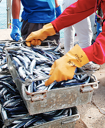 トビウオの漁法には、「曳き網漁」や「刺し網漁」、「定置網漁」など多くのものがありますが、今回はトビウオの漁獲量日本一を誇る屋久島の漁法をご紹介します。屋久島で最も漁の盛んな安房港では、「ロープ曳き漁」により漁を行っています。「ロープ曳き漁」は、2隻の船で網を引いて魚の群れを囲い込んでいくというもの。あごは表層を遊泳する魚のため、魚群探知機には映りません。漁師たちは海面を見つめ、船の接近に驚いて飛び出すあごの数からその群れの大きさを予測し、群れの動きや風向き、潮の流れを見極めて網を入れます。網は幅300m、その両端に600mのロープがつながっている全長1500mにもなる大仕掛けです。船が走ると、この長いロープから垂れ下がる短冊状のテープが海面をたたき、あごを驚かせ、群れを集めていきます。30分ほどで網あげとなるのですが、広げていた網を閉じるように巻きあげていった最後、漁師の一人が海に飛び込みます。漁師は、あごが飛んで網の外に逃げてしまわないように、網の内側のほうに追い込んでいきます。そして網がきゅっと狭まると同時に、海面に銀色の水しぶきがあがります。一度の漁には、一時間ほど要します。