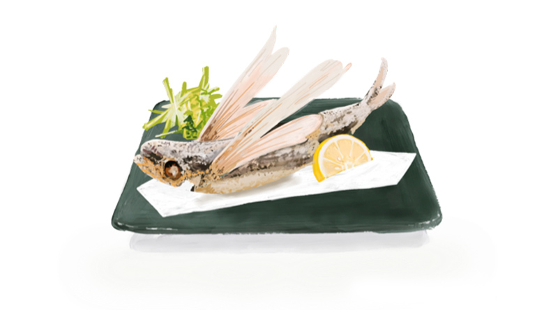 地元では刺身や一夜干しのほか、すり身をあげた「つけあげ」や、そのすり身をゆで卵のまわりにつけて揚げ、スコッチエッグのようにして食べる「ばくだん」も人気です。また、身だけでなく、魚卵を生のまま軍艦巻きにしたり、煮物に入れたり、白子を天ぷらにしたりと、幅広く食べられています。家庭ではお弁当のおかずに入れるなど、身近な食材として親しまれており、種子島ではトビウオのことを「トッピー」と呼ぶなど、愛称にも他の地域とは違った個性が光ります。