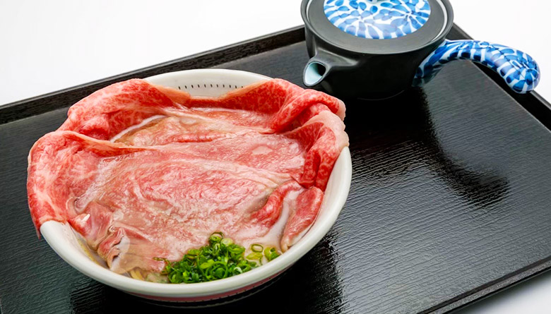 赤身の和牛が大胆に乗せられた一際豪華なラーメン。熱々のあご出汁を自ら注いでいただきます。お肉の上質な旨味が出汁に加わり、奥行きのある味わいに。お肉でぷりぷりした食感の中太ちぢれ麺を包んで食べると絶品です。
